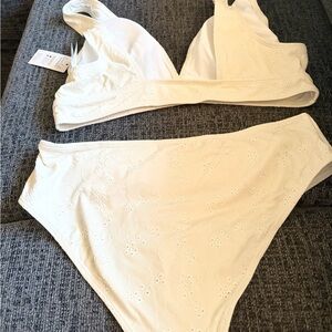 Elegant white bikini set by Cupshe. Features delicate embroidery. Perfect for beach days.