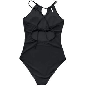one-piece, swimsuit, bathing suit, Cupshe, tummy control, high neck, lace-up back, polyester, spandex, black swimwear, women's, size L, modern fit