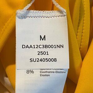 Bright and stylish Cupshe women’s two-piece bikini set in size Medium. Features a flattering V-neck twist front bikini top with adjustable straps and removable padding for comfort and support. Paired with a matching high-waisted bottom that offers cheeky moderate coverage, designed to smooth and flatter the waistline. Made with a blend of nylon and spandex for a stretchy, comfortable fit. Vibrant yellow color, perfect for beach days, vacations, or poolside lounging.