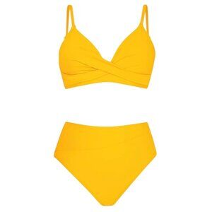Cupshe Women’s 2 Piece Swimsuit M Yellow V Neck Twist Bikini High Waist Cheeky