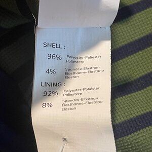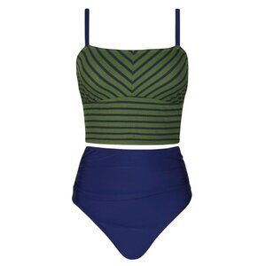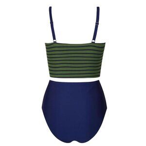 Turn heads this season in this Cupshe Women’s Two-Piece Swimsuit in size Medium. The set includes a green and blue striped square-neck crop top with adjustable straps, paired with a flattering high-waisted solid navy bottom. Perfect for pool days, tropical vacations, or beach outings.