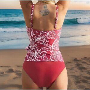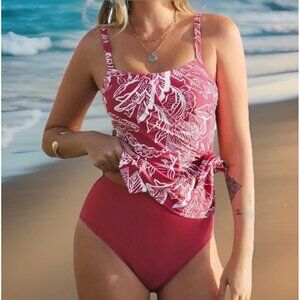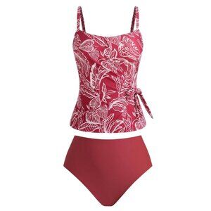 Turn heads at the beach or pool with this Cupshe women’s 2-piece tankini swimsuit in size Small. Features a red floral print top with a flattering square neckline, side tie detail, and adjustable straps for a comfortable, customizable fit. The solid high-waist bottoms provide tummy control and full coverage while keeping you stylish.