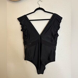 Cupshe Women's 2x NWT Black One Piece Swimsuit Ruffle V-Neck Mesh Waist Detail