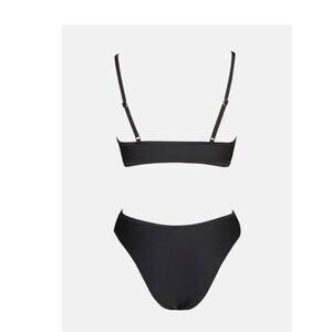 Cupshe 2-piece black ribbed bikini, size XS. Features a front cutout bralette top with adjustable straps and high-leg cheeky bottoms. Soft stretch fabric flatters the figure. Perfect for beach days, vacations, or poolside lounging.