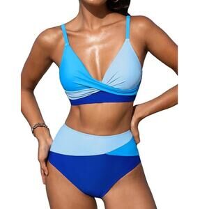 A stylish colorblock bikini set with a flattering high-waisted bottom and twist-front top, ideal for beach days or poolside relaxation.