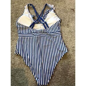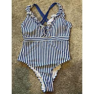 Cupshe Women’s Blue and White Striped Ruffle Cross Strap One Piece Swimsuit Size XL New no tags.