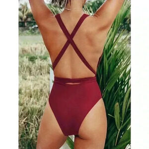 Cupshe Women's Burgandy One Piece Swimsuit Deep V Neck Self Tied Belt Bathing
