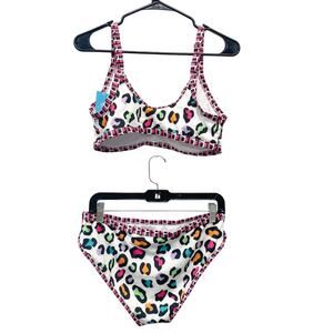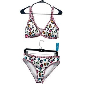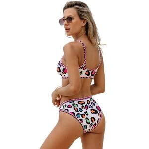 Stylish two-piece swimsuit featuring a vibrant leopard print with pink, black, and multicolor accents, designed for beach and poolside confidence.