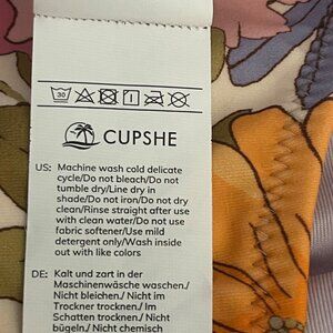 Cupshe women’s medium two-piece bikini featuring a vibrant pink floral print with orange, white, and lavender accents. Designed with a stylish one-shoulder scalloped neckline and supportive mid-rise bottoms for a flattering fit. Made with 80% polyamide and 20% elastane shell with a soft, breathable lining for all-day comfort. Perfect swimsuit for beach vacations, poolside lounging, tropical getaways, or summer parties.