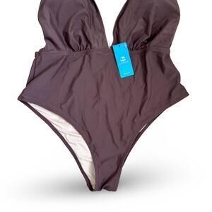 Cupshe Women’s L One Piece Swimsuit Brown Halter Deep V Plunge Monokini NWT