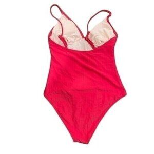 Chic Cupshe women’s one-piece swimsuit in size Medium. Features a flattering V-neckline with ruched front for a slimming effect, adjustable spaghetti straps, and high-cut legs for a modern, elongating look. Crafted in a vibrant pink color, this suit offers medium coverage and a comfortable fit. Perfect for poolside, beach vacations, or summer getaways.