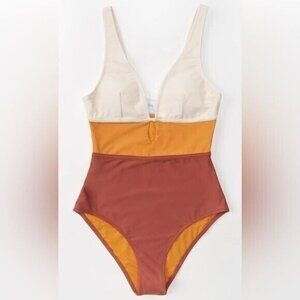 Cupshe Women’s One-Piece Swimsuit M Orange Color Block V-Neck Wide Strap Cheeky