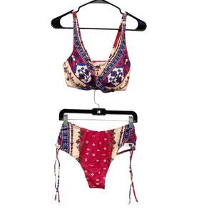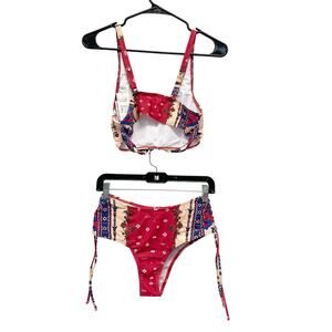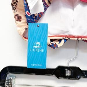 This Cupshe bikini set offers a boho-inspired design featuring a vibrant red and beige print. The set is crafted for a stylish and comfortable fit.
