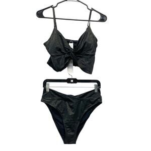 This stylish bikini set features a shimmering metallic finish with a chic twisted front top and flattering high-waisted bottoms.