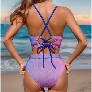 Cupshe XS Striped Bikini Set Blue Magenta 2 Piece V-Neckline High Waist Swimwear