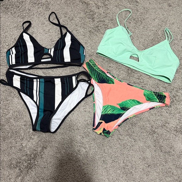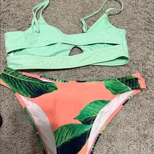 2 bathing suits for the price. These have been worn 1-2x and are in excellent condition. One is multi striped and the other is pink/salmon with green leaves