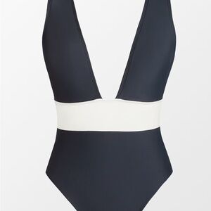 Stylish black and white one-piece swimsuit. Features a deep V-neck and a contrasting white band.