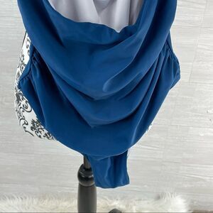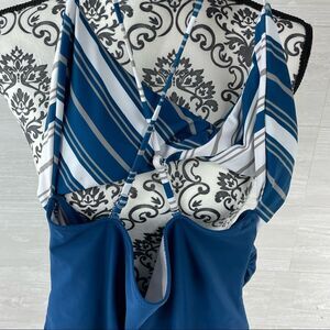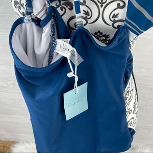 New without tags Cupshe Sparkle In The Sun bathing suit size large. This adorable one pice swimsuit is high waisted with cutouts, adjustable straps that can be criss cross or regular, twisted top with padding in the cups. Blue and white with striped polyester/spandex blend material with stretch. Bought and tried on but never worn, one small dot as pictured.