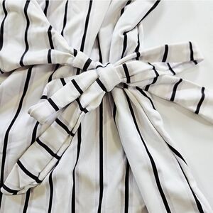 Embrace effortless beach elegance with this Cupshe Stay Young black-and-white striped one-piece swimsuit. Featuring a wrap-tie design, and adjustable straps this pre-loved piece offers a flattering fit and timeless style—perfect for summer adventures.