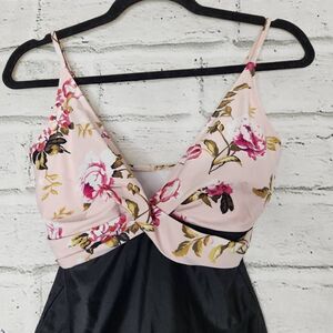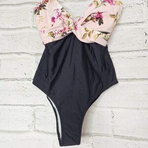 Cupshe Women's Black Pink Floral Twist Front Adjustable Straps One Piece Swimsuit Size Small