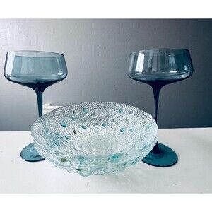 Curated glassware bundle including 2 modern coupe cocktail glasses and 2 vintage pressed glass “asteroid” bowls.