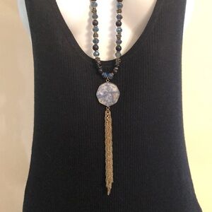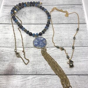 Gold tone faux pearl Monet necklace. Unbranded but a well made antique brass tone crystal necklace with sodalite tassel pendant.