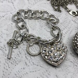 Silver tone toggle clasp rhinestone puff heart charm bracelet.