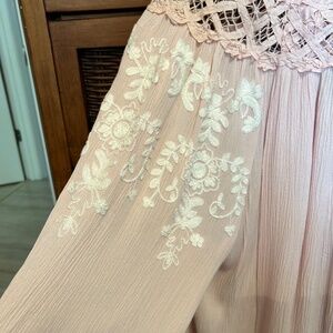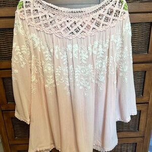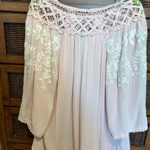 Sip a margarita and dance the night away in this beautiful, embroidered fiesta blouse. Light and breezy made of 100% viscose this peasant top will be just the ticket. Features include soft pink fabric with white embroidery and lace neckline, the back is enhanced with a center pleat, 3/4 sleeves. it is flowy and roomy and the look is feminine.