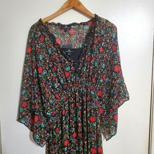 Beautiful multi-colored floral print maxi sundress. Stretchy waist. Has underneath dress cami. Bat drape sleeves. It's new with tags. Please refer to pictures for best description and condition verification.