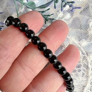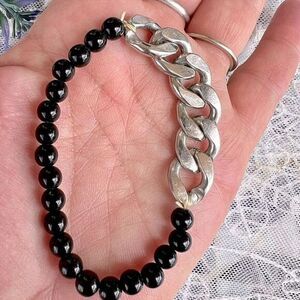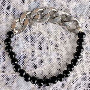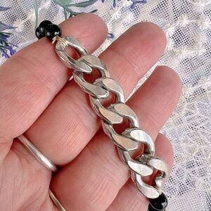 What a comfy cutie! Black Onyx beads mix with thick silver tone chain link. Shown on my 6.75” wrist and is a perfect fit - some leeway.