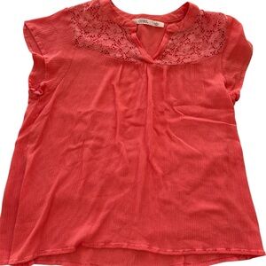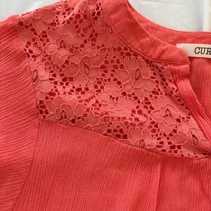 Cure Cap Sleeve Top with Lace Inserts. Size Large. Orange. V-neck with lace. Base shirt is 100% rayon. Contrast lace is 90% nylon, 10% spandex. Approx. measurements: pit to pit 22", shoulder to bottom hem 24". Excellent preowned condition. No flaws, rips, stains.