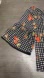 Black & white gingham print overlaid with bright orange and yellow flowers with green leaves.