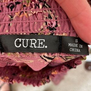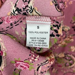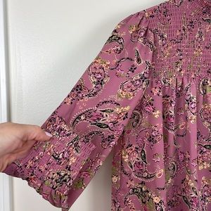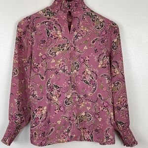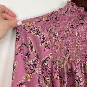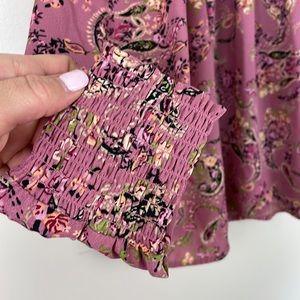 Cure Pink Floral Blouse. Pretty flowy blouse with a smocked neckline and at arm cuffs.