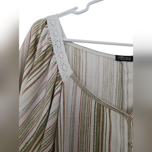 Stylish striped top with lace accents. Features a V-neck and short sleeves. Perfect for casual wear.