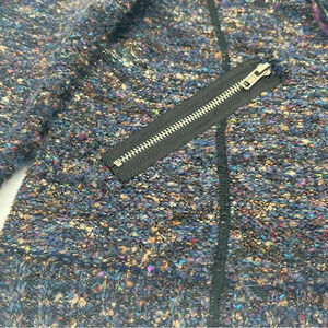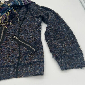 • Details: Multicolor tweed fabric, decorative zipper accents, and striped knit scarf with fringe