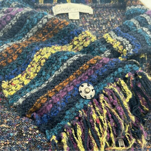 Elevate your wardrobe with this cozy yet stylish Curio New York Multicolor Cardigan in size Large. This unique piece features a woven multicolor body paired with an attached knit scarf in vibrant stripes, adding both warmth and charm to your look. Perfect for layering during the cooler months, this cardigan is both fashionable and functional.