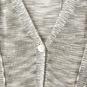 Knit, lightweight with cream tan and off white colors, one button front closure, high low, linen blend.