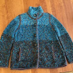 Jewel tone Bulky textured sweater. Pockets on both sides of front. Large buttons down the front. Teal purple brown and turquoise. Pop of color to enhance any outfit. Swing style that widens as it continues down to the hem. In excellent pre loved condition.