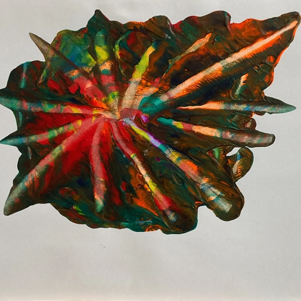 Vibrant abstract art piece featuring a stunning blend of red, green, and orange hues. Perfect for adding a splash of color to any room. 8.5 x 5.5 inches acrylic on paper.