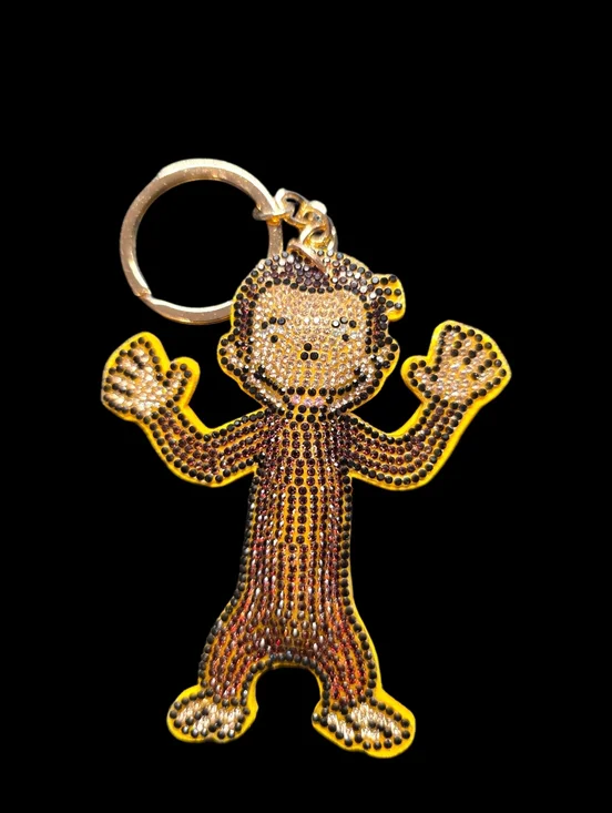 Cute brown Curious George keychain for kids. Sparkling beaded design adds playful shine. Lightweight and durable for backpacks and bags. Easy-to-use ring secures keys or accessories.