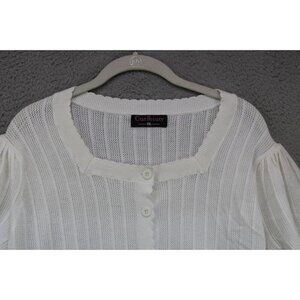 This is a Vintage Curlbiuty Short Sleeve Scalloped Open Knit Button-Up Sweater that is a size 2XL. It is 55% Viscose, 40% Polyamide, and 5% Spandex. It is very feminine with small scallops around the neckline. Laying flat, it measures: Armpit to armpit-24" and the Length is 23". It is in good condition.