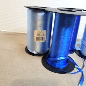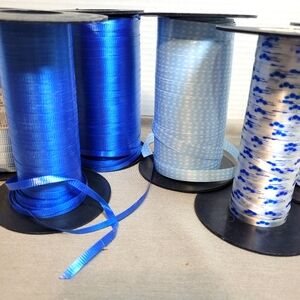 Lot of 5 used and 1 new blue curling ribbon. One of the light blue ribbons has a white dot pattern on it. 2 of the ribbons are white with blue balloons on them. Please feel free to ask any questions or make an offer