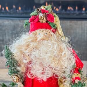 Curly Bearded Santa Claus in Red, Gold & Greenery Tree Top/Table Top Decor, 13”H