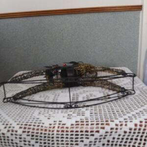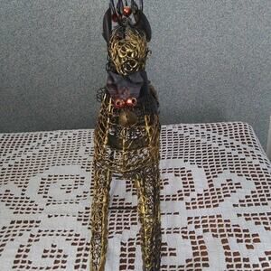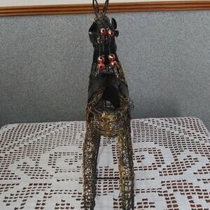 Curly twisted wire reindeer. Rocks like a rocking horse. Decorated with holly berries and leaves on his head. Some of the red color has come off the berries. Jingle bell collar does jingle a bit. Lightweight. Body is golden while rocker, collar and ears are black Saddle is dark brown. Make me an offer! Bundles of 2 or more items get a discount!