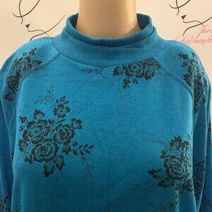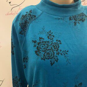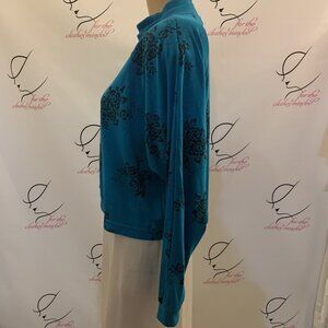 Currant by Jeri Jo. Size Medium, Cropped Sweatshirt. Raglan Sleeves. Center back 18.8". Raglan sleeve 23" wrist to shoulder". Bust 24/48". Poly/Cotton Blend. Shoulder pads. Very good pre-loved condition.