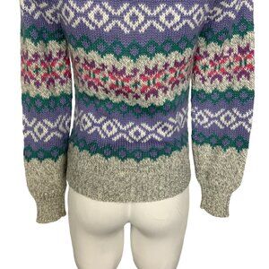This Currants By Jeri Jo women's Vintage Sweater makes a statement due to it's long sleeves, puff shoulder, chunky knit, pullover fit, crewneck and gray/purple/pink/green striped design.