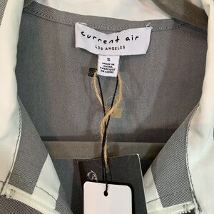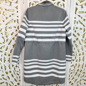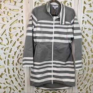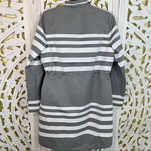 Gorgeous striped raincoat - great print mixing opportunities with this piece. A raincoat but can be an awesome graphic topper for lots of outfits: over a band tee and jeans, with a dress and big statement necklace, so many options! Has a cord inside for adjustment at waist. Front zip.