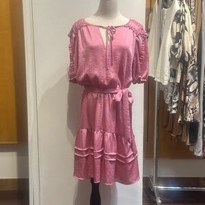Chic pink mini dress with ruffle sleeves. Features a tie waist and tiered skirt. Perfect for a stylish look.