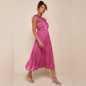 This elegant red dress with ruffled details and elastic waist band. Perfect for any occasion, warm once to holiday party. I’m about 5’6 and it fit a few inches above the knee. Color is a mix between red and blush pink.