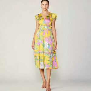 Current Air Seria Midi Dress Marigold V-neck Pleated Floral Flutter Sleeve Size Small
